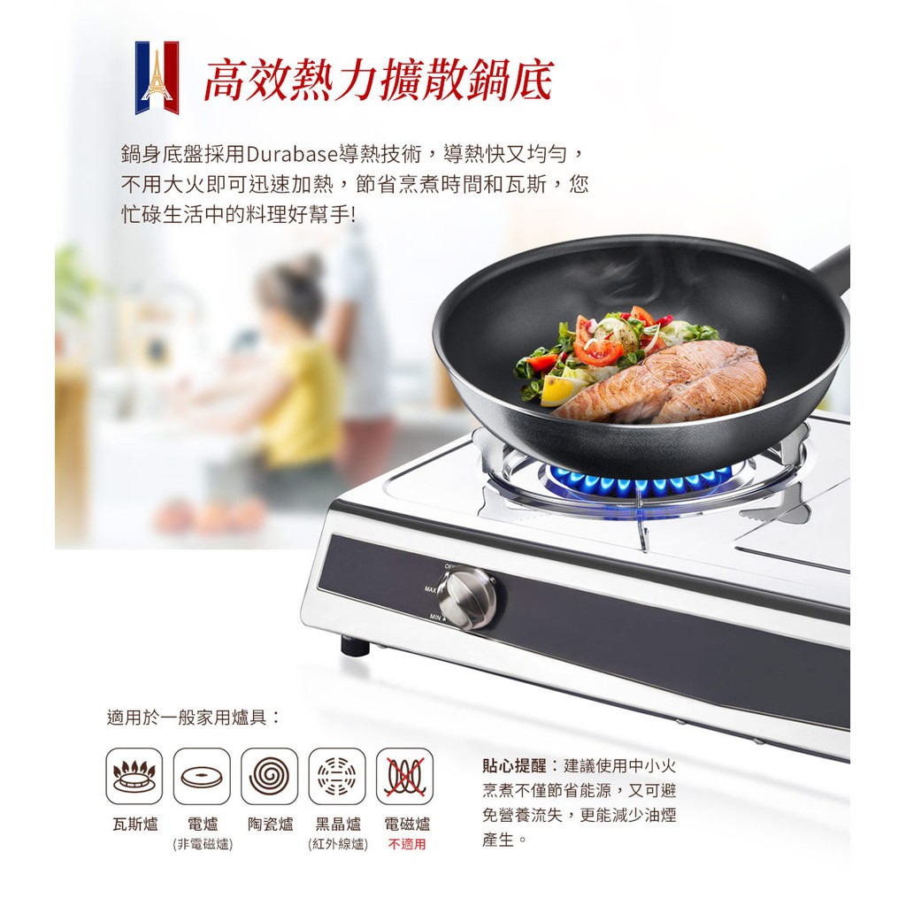 4.特福不沾鍋因鍋底設計具有高傳熱功能,建議用中小火烹調即可,節省能源又可避免營養流失,更能減少油煙的產生。
