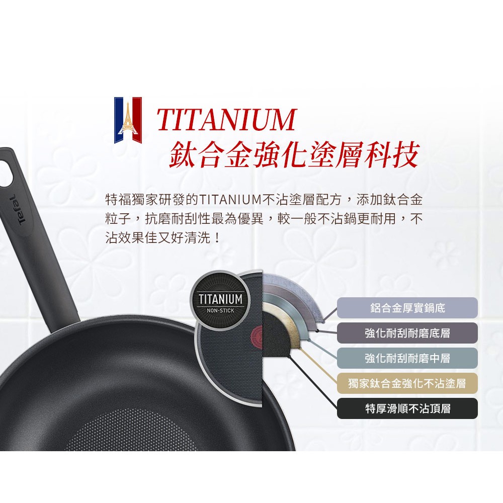 採用Tefal獨家研發的TITANIUM鈦合金強化不沾塗層,添加鈦合金微粒子,表面滑順又抗磨耐刮,不沾效果佳、好清洗!加深容量及易傾倒鍋緣設計,讓您為家人下廚更輕鬆愉快,享受美味料理,天天都是家庭日!