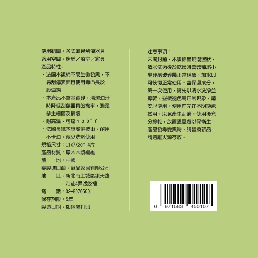 法國木漿棉不易生黴發黑,不易刮傷表面且使用壽命長一般海綿‧本產品不含金鋼砂,清潔油汙時降低刮傷器具的機率,避免孳生細菌及損壞‧耐高溫,可達100°C‧法國長纖木漿發泡技術,耐用不卡油,減少洗劑使用規格尺寸:11x7X2cm 4片產品材質:原木木漿纖維產 地:中國