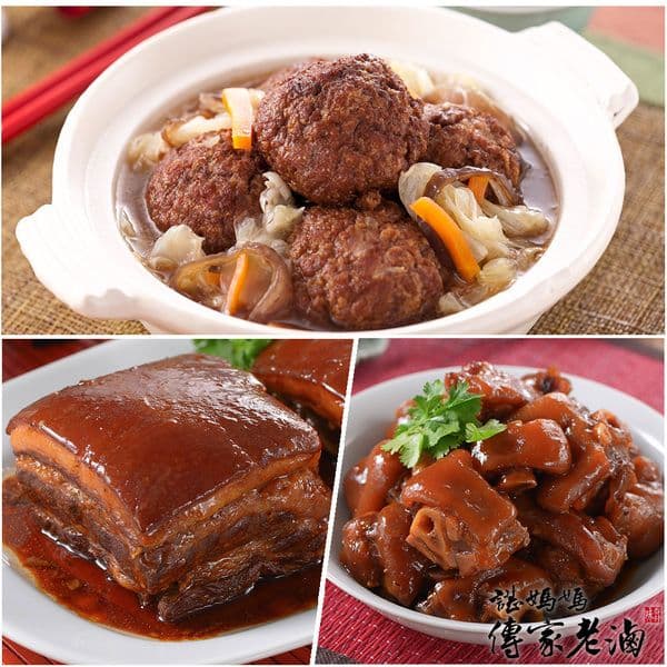 1.商品品名:【諶媽媽眷村菜】紅燒獅子頭(2000g/包)+東坡肉(500g/包)+冰釀東坡蹄花豬腳(650g/包)