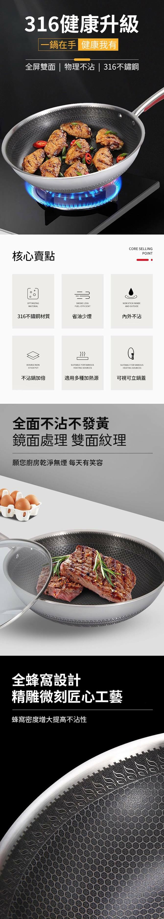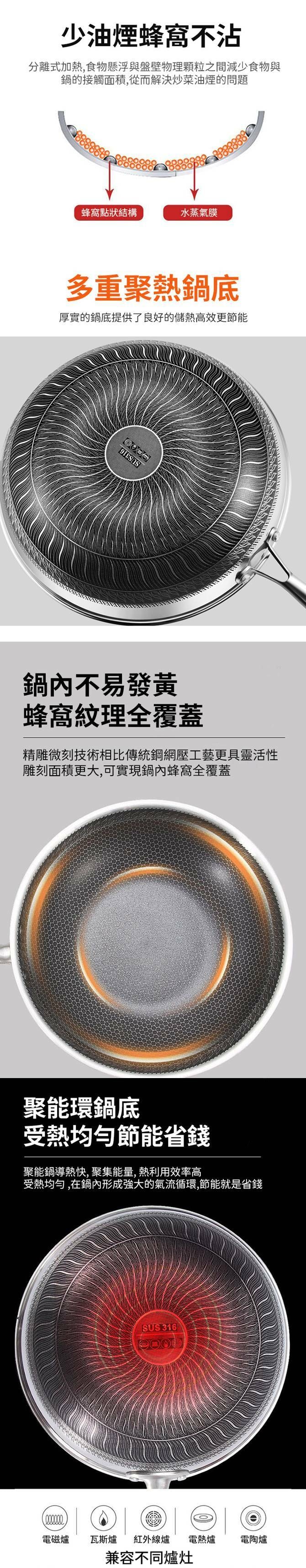 【U-Like】(德國KNF加大316不鏽鋼雙面蜂窩炒鍋34cm 316鍋 不沾鍋 炒菜鍋 不鏽鋼炒鍋 煎鍋 鍋蓋感溫設計 鍋具 雙面不沾鍋