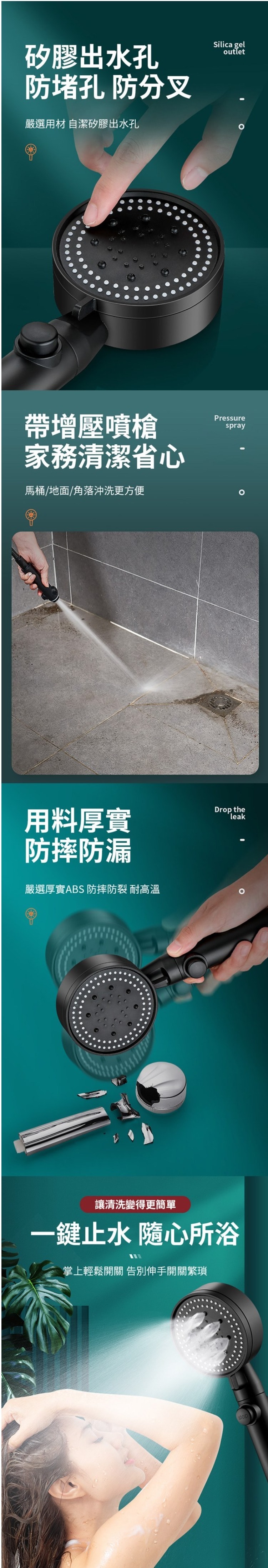 矽膠出水孔設計,出水順暢不堵塞,如春雨般的沐浴體驗