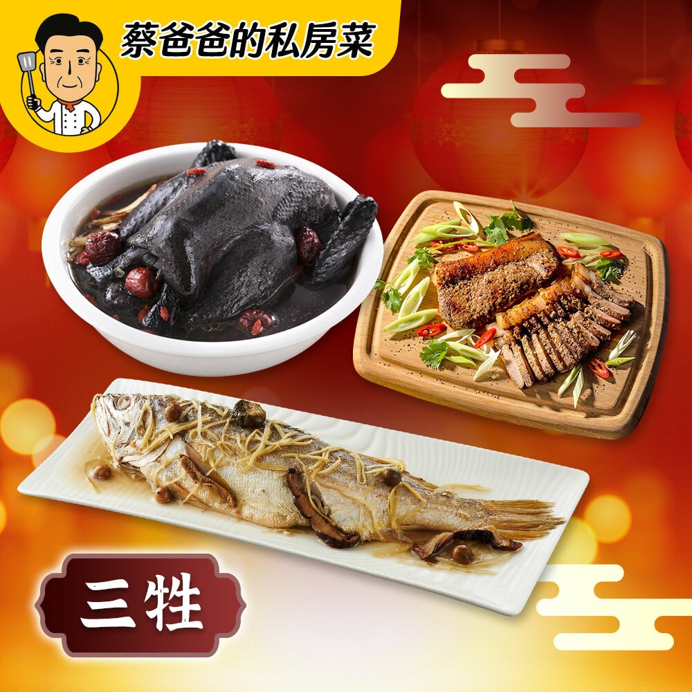 2.商品品名:【蔡爸爸的私房菜】拜拜三牲套組(香薑樹子清蒸整尾鱸魚+古法秘醃鹹豬肉300g+黑蒜烏骨全雞2300g)