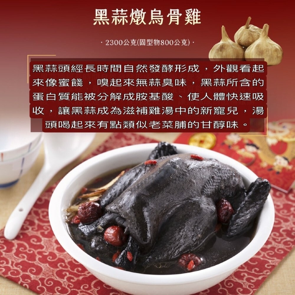 【黑蒜烏骨全雞】烏骨雞、黑蒜仁、蒜片、川芎、薑片、枸杞、紅棗、鹽、水、雞粉、糖、洋蔥粉。