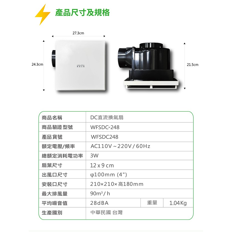 商品品名:【太星電工】 喜馬拉雅-DC直流變頻換氣扇(3W) WFSDC248