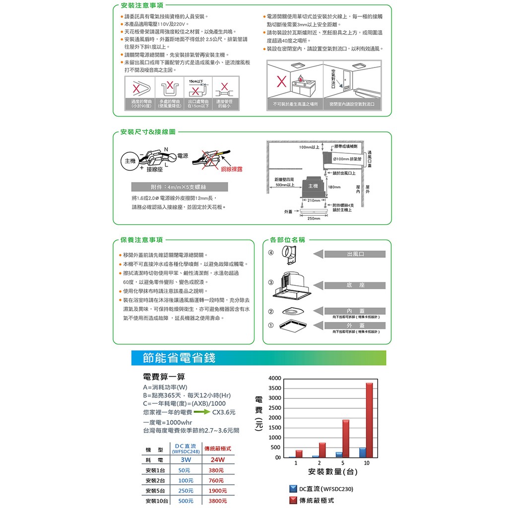 7.DC 3W-採用超靜音3W DC直流變頻馬達,比一般24W蔽極式馬達,節省80%以上耗電。