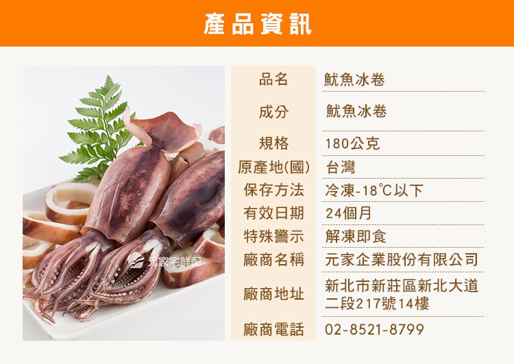 商品規格 : 【元家】鮮甜魷魚冰卷8包(225g/包)