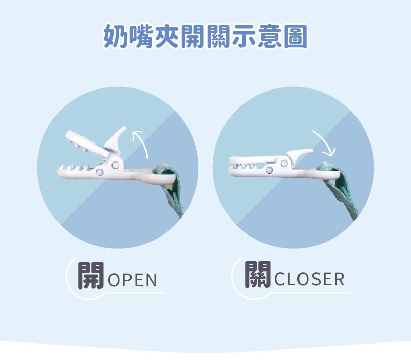 (1)奶嘴夾主要功用為防止奶嘴掉落,而不是咀嚼開發。