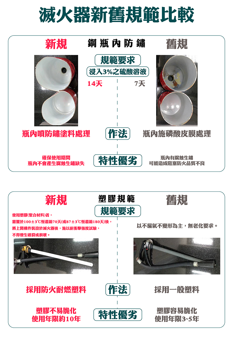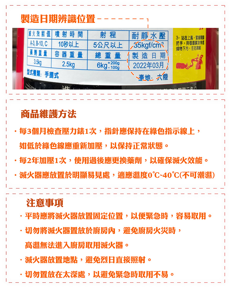 ◆產品規格.蓄壓式(附錶式).藥劑總量:3.5公斤.容器總量:2.5公斤.總重量:6公斤.尺吋:47(高)x18.5(寬)x13(深) /(公分).滅火值:A3.B10.C.射程:5公尺以上.時間:10秒以上.蓄壓壓力:13.7+_0.7kgf/cm.容器耐壓:35kgf/cm.有效期限:三年