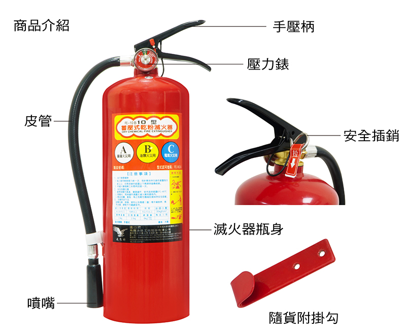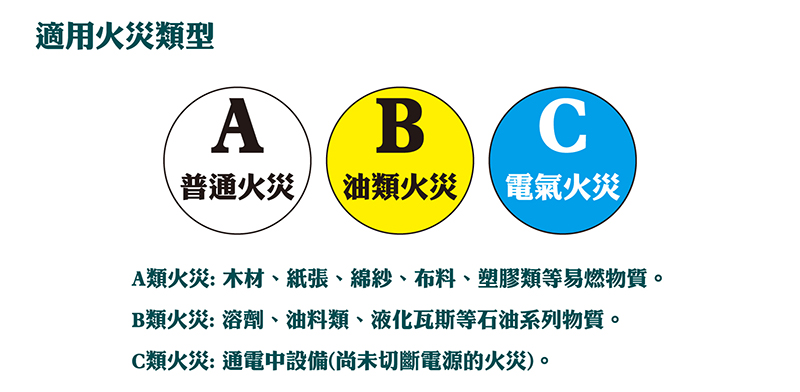 ◆產品特色.符合CNS 1387-Z2003 國家消防法標準產品.A類火災/ B類火災/C類火災皆可用,適用滅火材質如下:A類火災: 木材、紙張、綿紗、布料、塑膠類等易燃物質。B類火災: 溶劑、油料類、液化瓦斯等石油系列物質。C類火災: 通電中設備(尚未切斷電源的火災)。