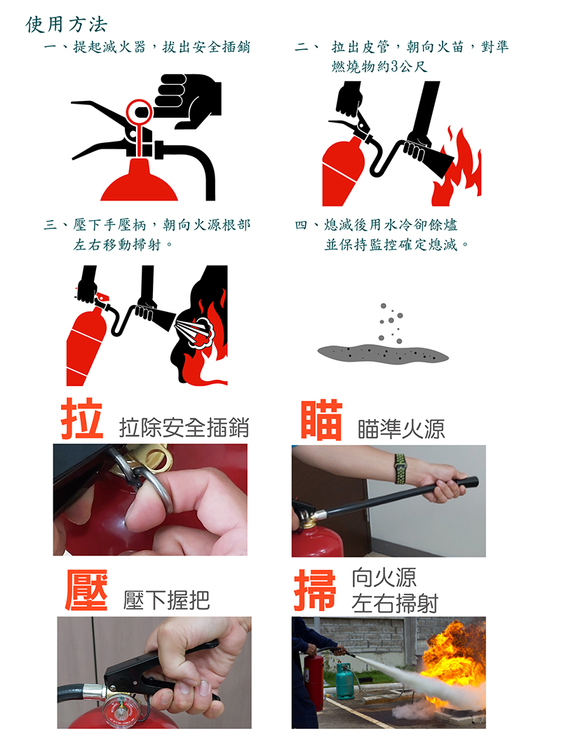 ◆使用方法步驟:一、提起滅火器,拔出保險插梢二、握住喇叭噴嘴前握把三、握住皮管,朝向火苗,對準燃燒物約3公尺四、壓下手壓柄,朝向火源根部噴左右移動掃射五、熄滅後用水冷卻餘燼並保持監控確定熄滅