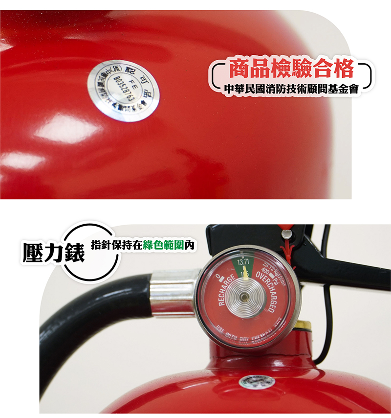 ◆產品維護方法.每三個月檢查壓力錶一次,指針應保持在綠色指示線上 ,如降至綠色指示線以下應重新加壓,保持正常狀況。.每二年加壓一次,使用過後應換裝藥劑,以確保滅火效能。.應掛於明顯易見處,適應溫度0℃~40℃(不可潮濕)