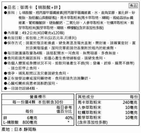 L-精胺酸、羥丙基甲基纖維素(羥丙基甲基纖維素、水、鹿角菜膠、氯化鉀、矽樹脂、脂肪酸山梨醇酐酯)、馬卡萃取粉末(馬卡萃取物、糊精)、微晶狀a-纖維素、葡萄糖酸鋅、硬脂酸鈣、二氧化矽、人蔘萃取粉末、牡蠣萃取粉末、穀芽萃取粉末(穀芽萃取物、糊精、檸檬酸)(含非添加性多胺)。