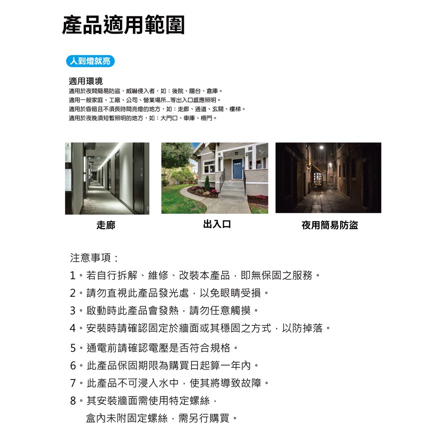 一般家庭、工廠、公司、營業場所…等出入口感應照明。