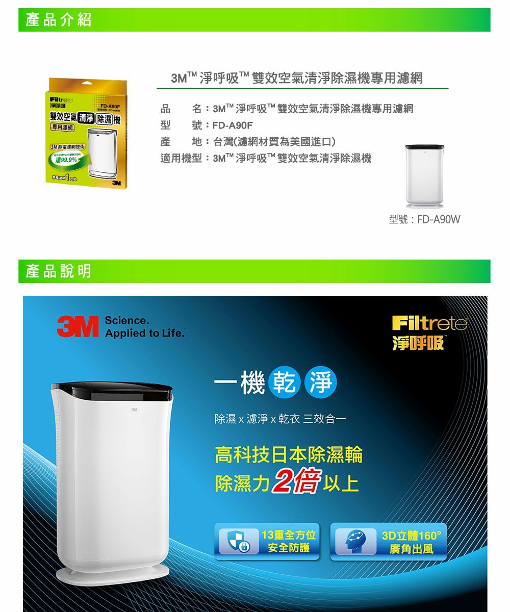3M 淨呼吸 FD-A90W 雙效空氣清淨除濕機專用靜電空氣濾網-FD-A90F-1入裝