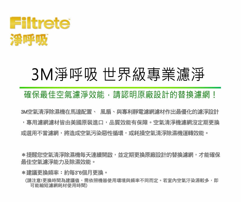 ◆3M靜電濾網連續使用90天或2160小時後建議定期更換(更換濾網使用時間請視家中空氣品質實際狀況而定,以上為一般空氣品質之建議使用時數)。