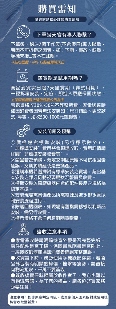 ◆大型家電需預約配送,安裝時間約需要7-1107工作天(以師傅實際排單日期為準),如遇旺季原廠缺貨或是偏遠地區則需更久,敬請見諒!