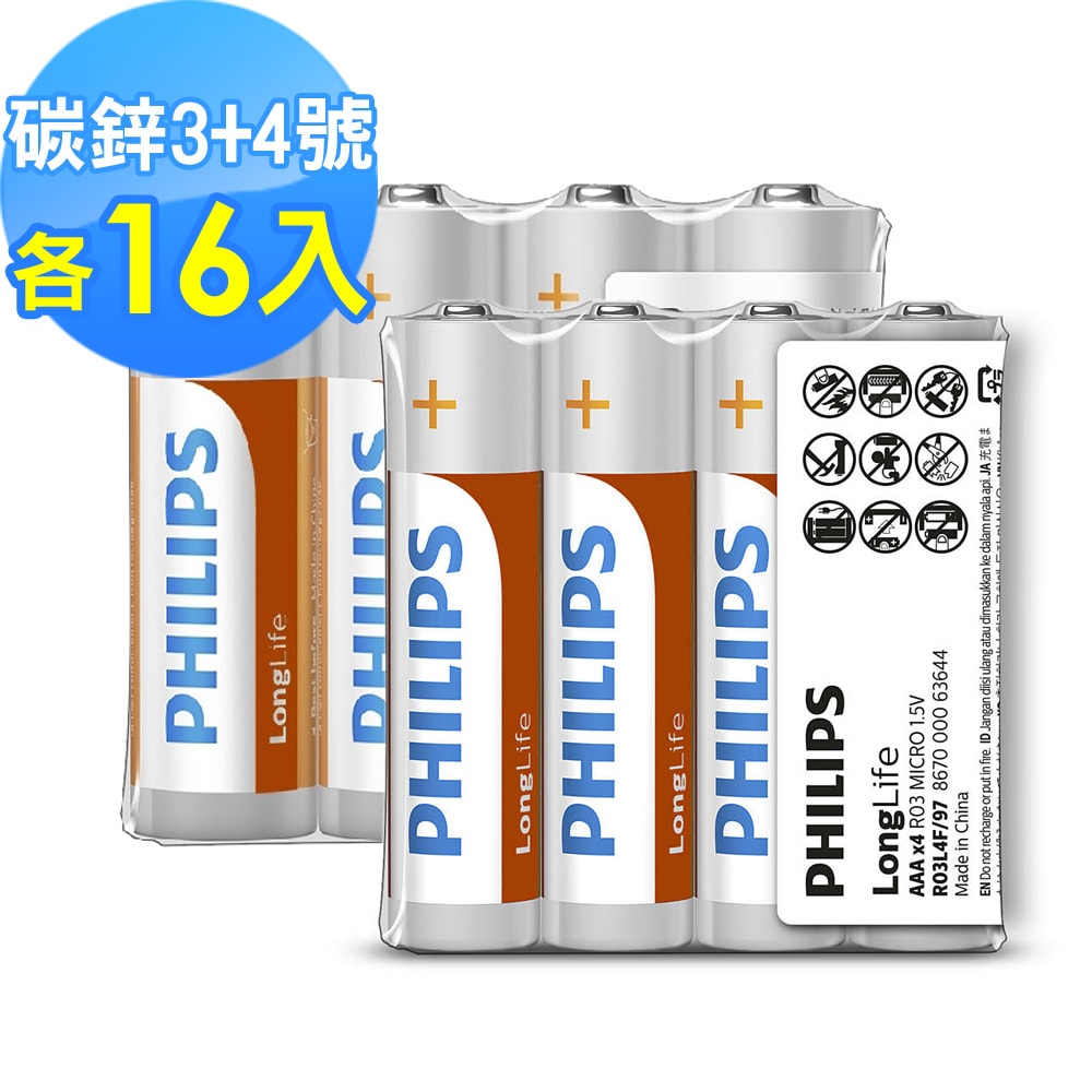 產品名稱:【Philips 飛利浦】3+4號 LongLife 碳鋅電池 ( 各16顆 )