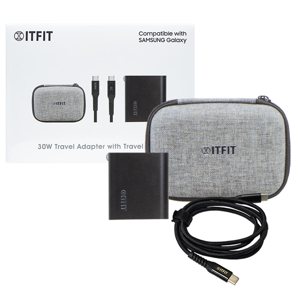 商品內容物:ITFIT 30W GaN雙孔 電源供應器 *1 、3A 60W Type-C to Type-C 數顯快充線-1.2M *1、ITFIT旅行收納包 *1、使用說明書