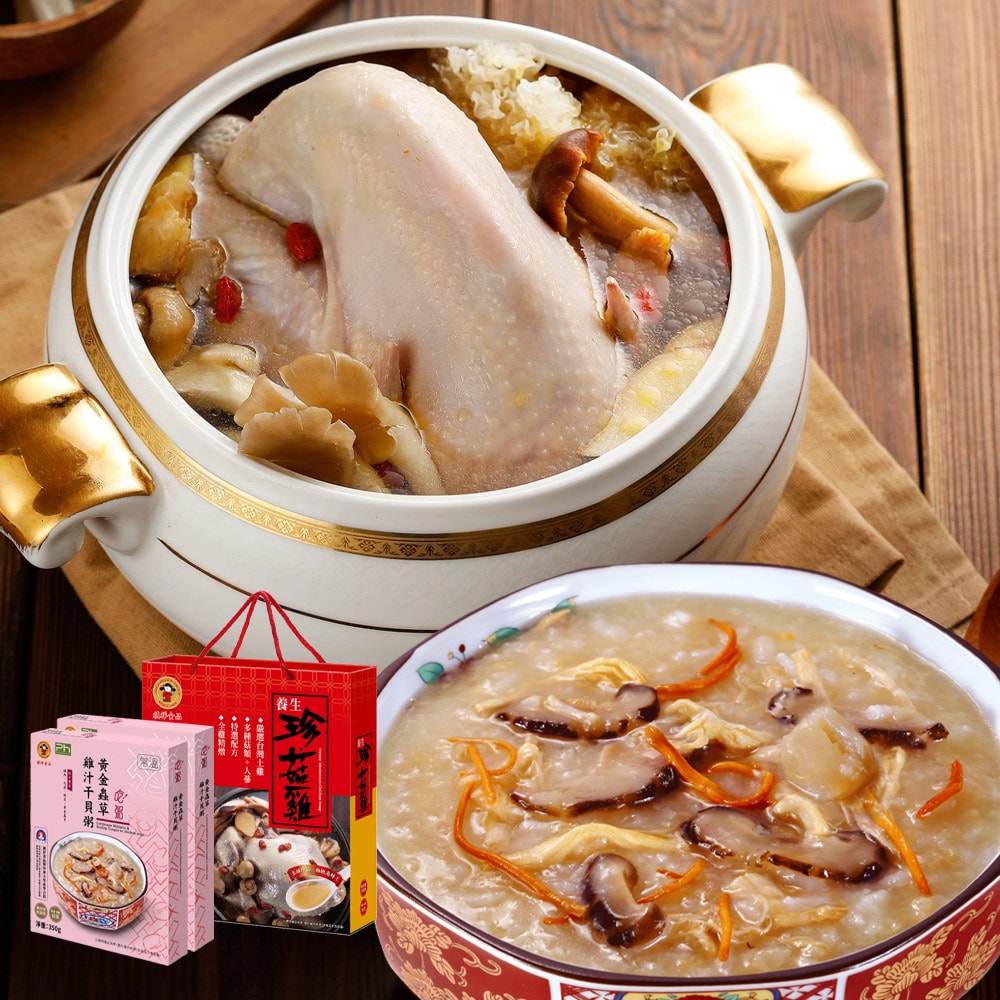 品名:《禎祥》養生珍菇雞(3500g)*1盒+黃金蟲草雞汁干貝粥*(350g)*2盒
