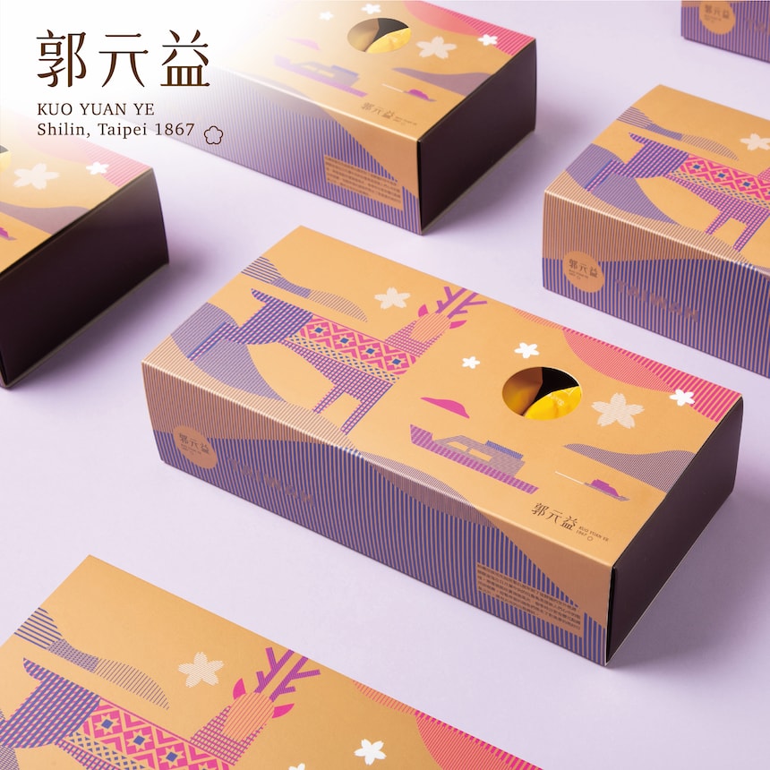 郭元益以"文創台北、美食台灣"概念打造特色伴手禮,特別邀請台灣知名文創品牌-兩個八月設計以台灣意象概念的鳳梨酥包裝。