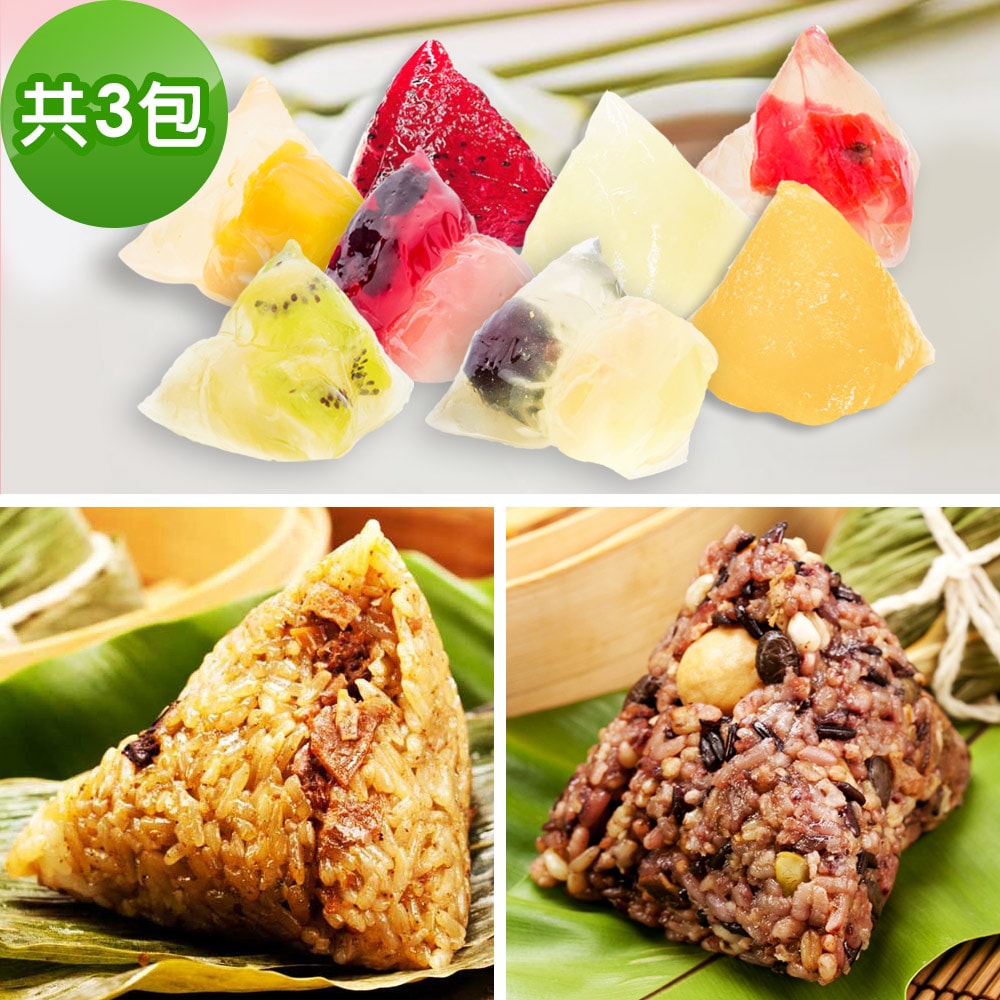 組合:招牌素食滷香粽子x6顆/包+素食養生粽子x6顆/包+繽紛蒟蒻水果冰粽x12顆/包