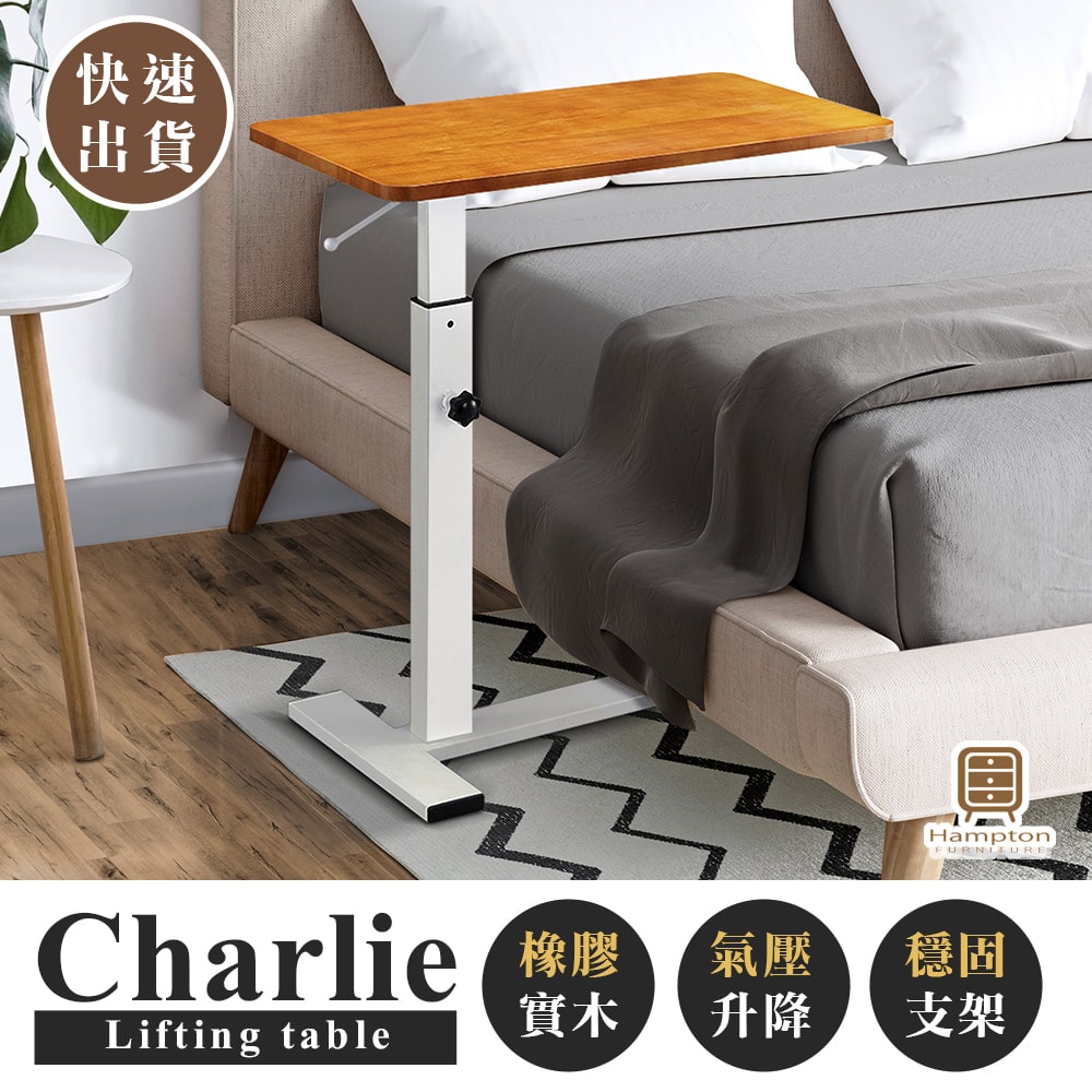 】 查理實木氣壓升降桌-柚木色-白腳