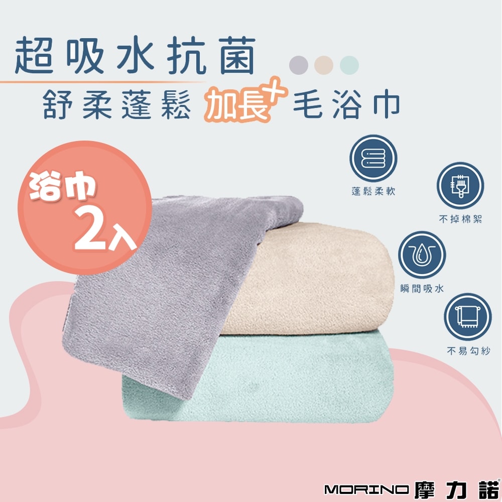 【MORINO 摩力諾】 (超值2入組) 超吸水抗菌舒柔蓬鬆加長浴巾_90*170cm 抗菌消臭 瞬吸速乾 MO883