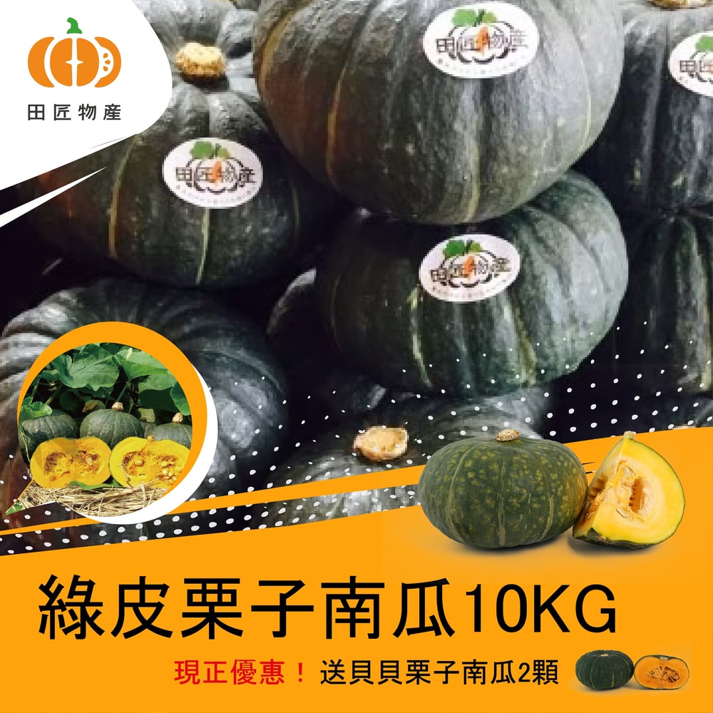 1.商品品名: 北海道種綠皮栗子南瓜10kg+貝貝栗子南瓜2顆