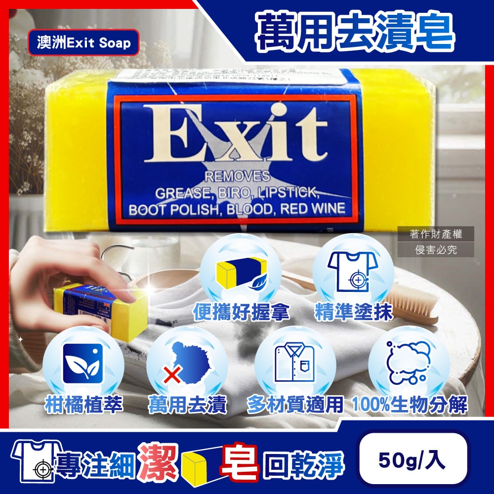 【澳洲Exit Soap】 植萃居家萬用清潔衣物布織品神奇去漬皂50g/入(污漬淨化預洗劑,衣領袖口局部髒污血漬洗滌皂,多用途強力去污除頑固油垢肥皂)