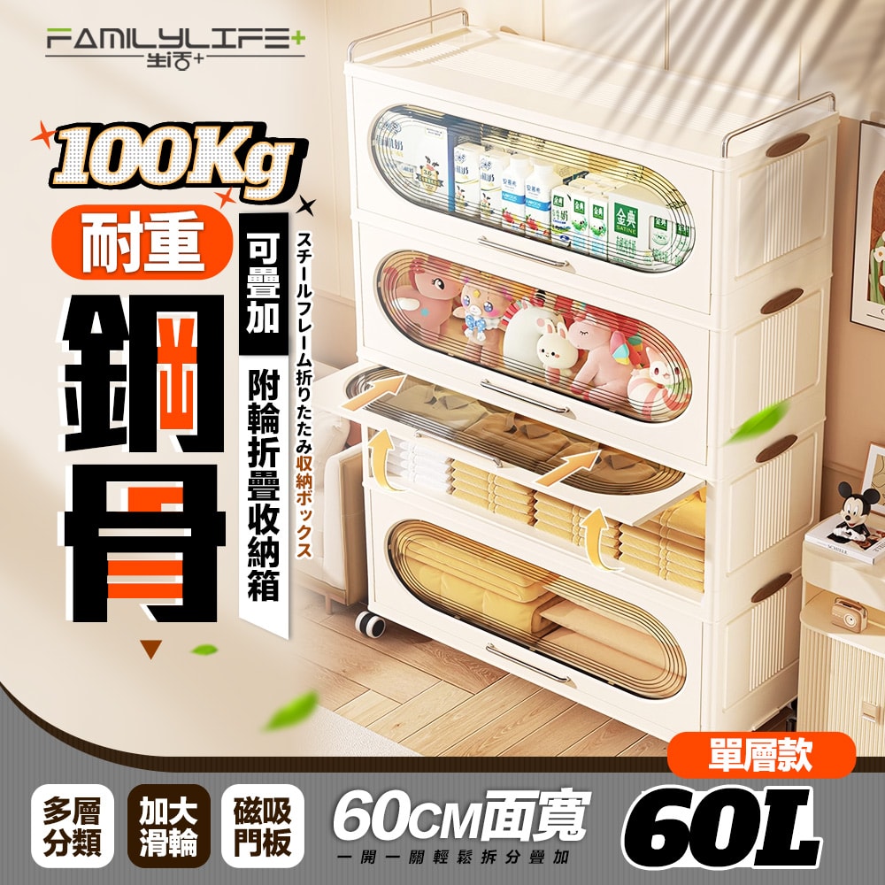 【FL生活+】 超耐重60公升鋼骨單層可疊加折疊收納箱(收納櫃/鋼骨/超耐重100KG/磁吸門板/YG-217)