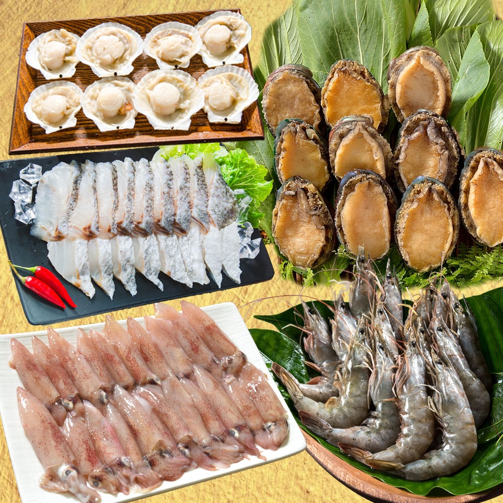 2.商品組合/規格:5件海鮮組-->白蝦600g規格41/50*1盒+帶殼鮑魚(10顆)*1包+鱸魚切片(200G)*1包+扇貝(300G)*1包+咪咪小卷(300G)*1包