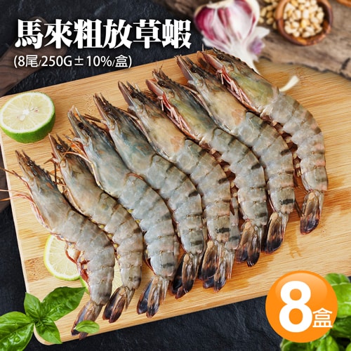 1.商品品名:馬來粗放草蝦8尾x8盒(250g/盒)