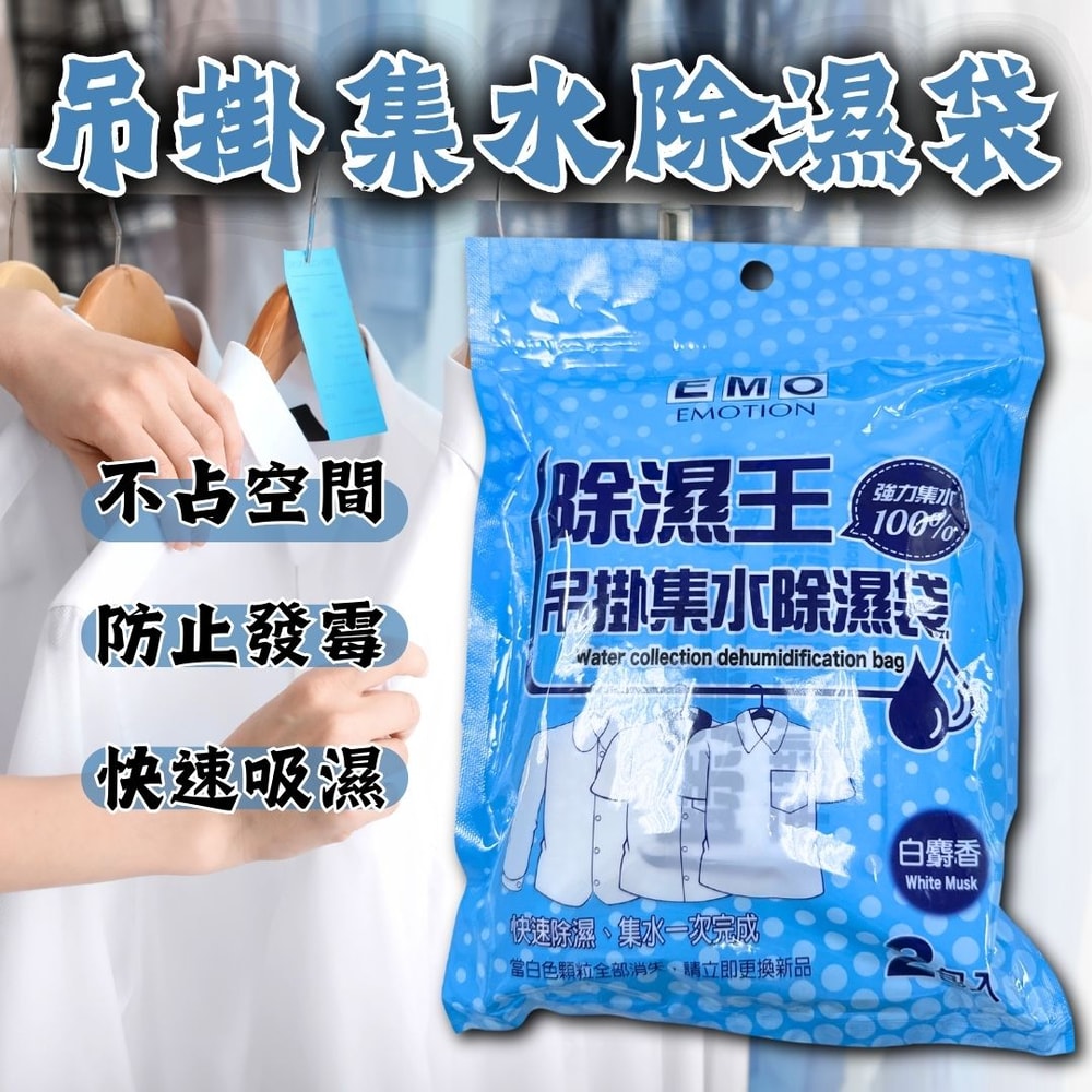 EMO吊掛式集水除濕袋,體積小、不佔空間,能快速吸濕,讓衣服不會因濕氣而發霉,可有效去除衣櫥內異味,使用簡單,讓您生活更簡單,安心放置使用,衛生又乾淨。