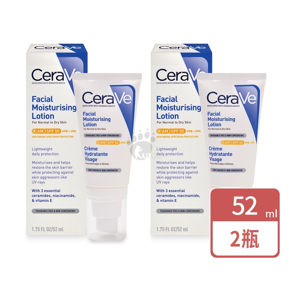 【CeraVe 適樂膚】 全效清爽修護防曬乳 SPF50 52ml/2瓶