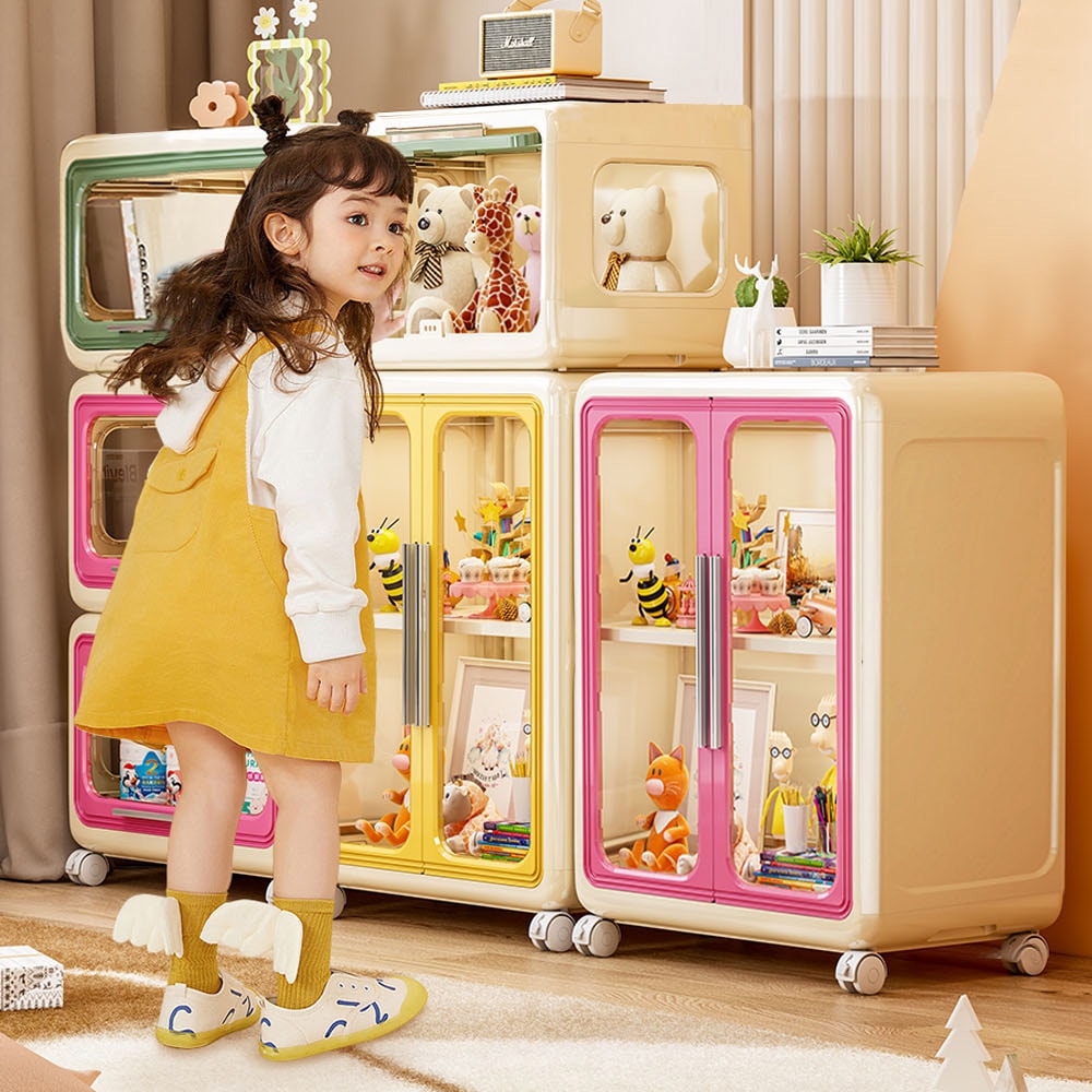 】 奶油撞色附輪可疊加雙開門收納櫃(收納櫃 置物櫃 辦公櫃 書櫃 展示櫃)