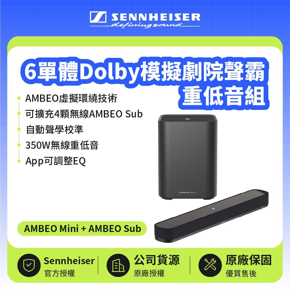 【SENNHEISER 森海塞爾】 AMBEO Mini + AMBEO Sub 6單體Dolby模擬劇院聲霸重低音組 | 兩年保固(宙宣公司貨)