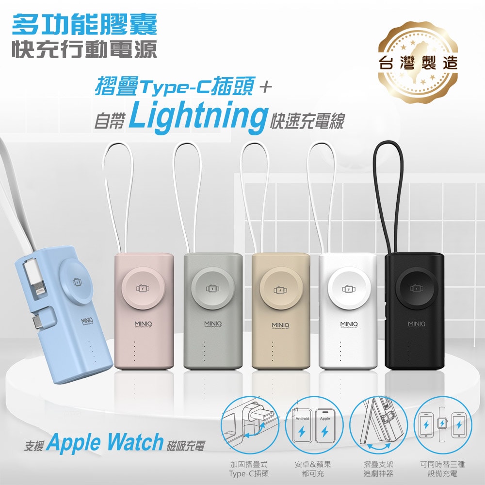 MINIQ 台灣製造 5000mAh Type-C多功能膠囊快充行動電源(自帶Lightning快充線)