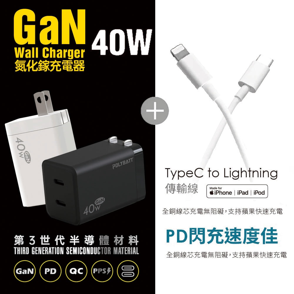 【Polybatt】40W氮化鎵 雙孔PD極速充電器+Type-C to Lightning 蘋果認證PD快充線