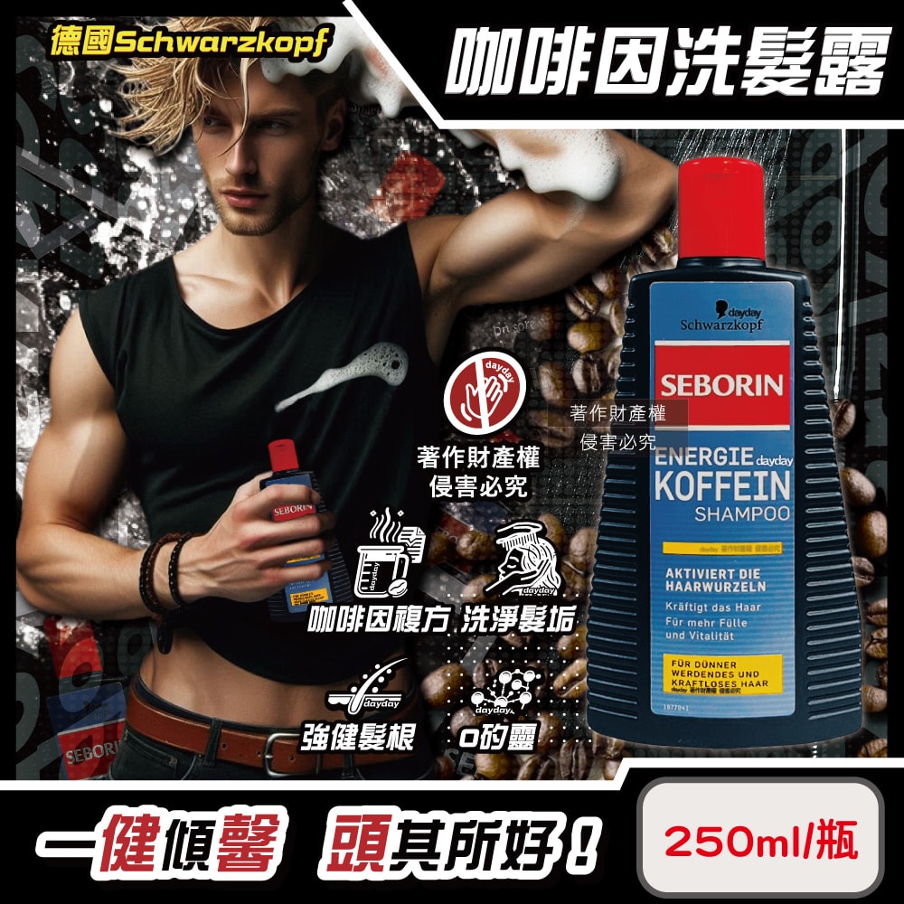 【Schwarzkopf 施華蔻】 SEBORIN無矽靈咖啡因洗髮露250ml/瓶-一般黃標(男士芳香去味活性洗髮精,強健髮根潤護頭皮潔淨露,適用全髮質修護毛躁)