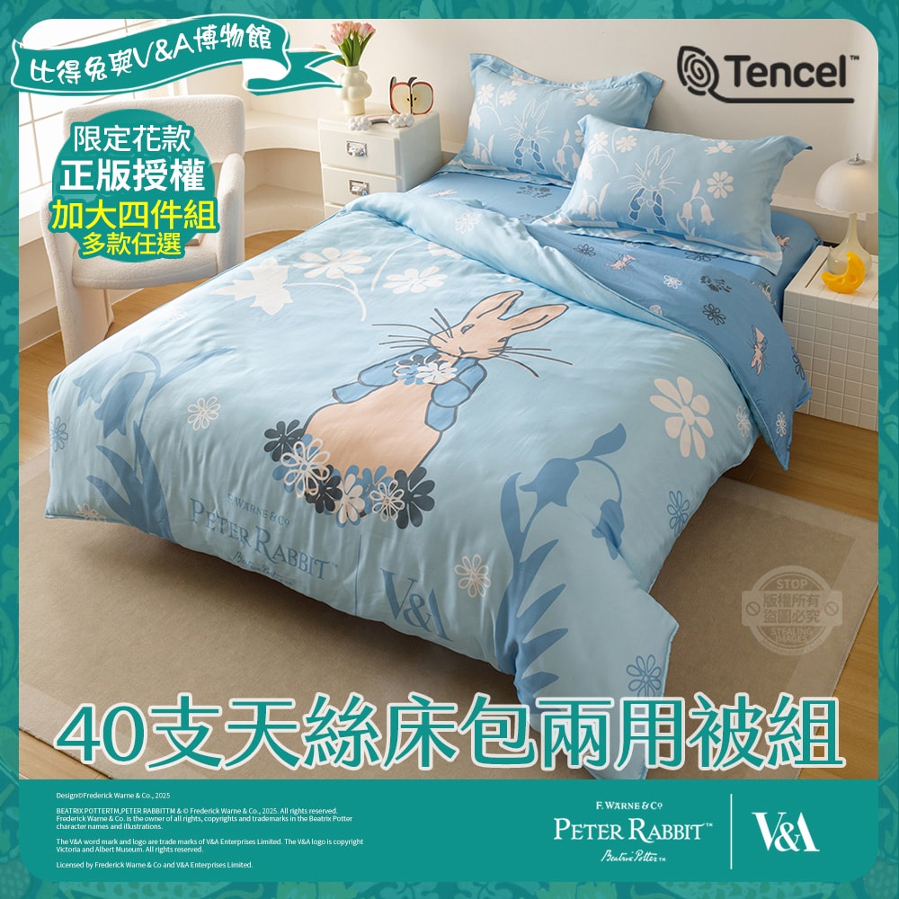 【PETER RABBIT 比得兔】 比得兔與V&A博物館 加大40支天絲床包兩用被組(多款任選/正版授權/天絲/兩用被)
