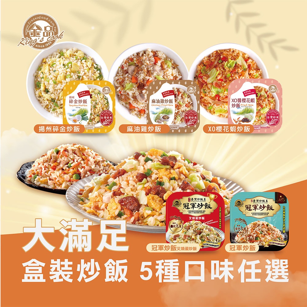 商品品名:盒裝炒飯(麻油雞炒飯、XO醬櫻花蝦炒飯、揚州碎金炒飯、肉絲蛋炒飯、叉燒蛋炒飯 )