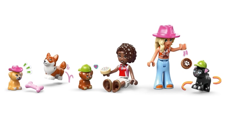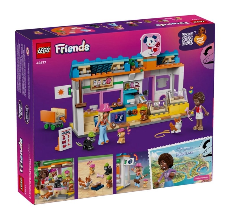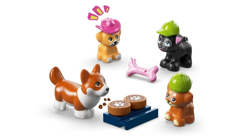 此角色扮演盒組配有 2 個樂高娃娃、4 隻玩具狗與豐富的寵物配件,讓孩子在烘焙坊裡享受長久的歡樂時光。細節包括菜單、甜甜圈、餅乾、狗狗點心、骨頭、牛奶、杯子等等。