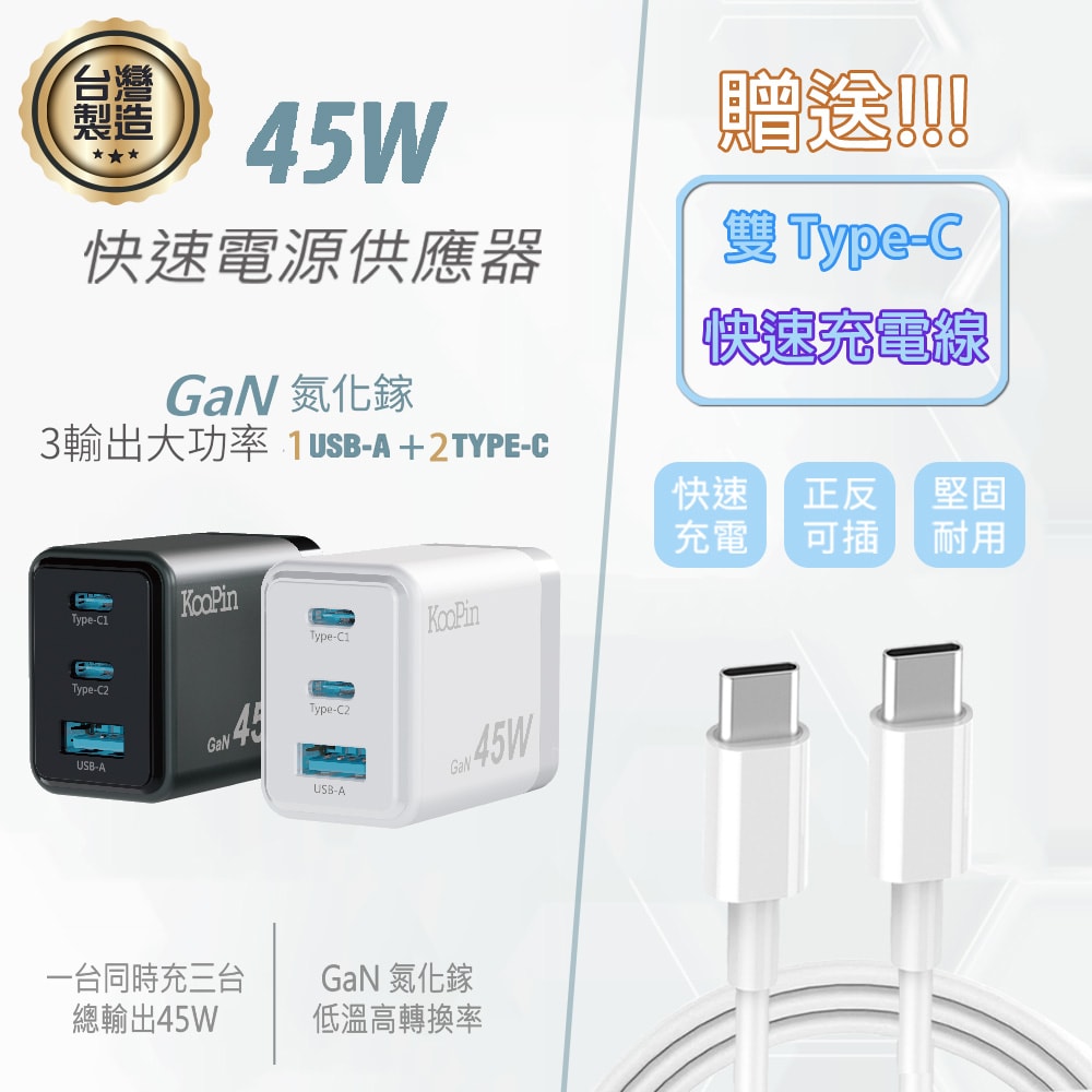 KooPin 台灣製造45W氮化鎵 雙USB-C+USB-A手機急速快充充電器(附贈Type-C充電線)